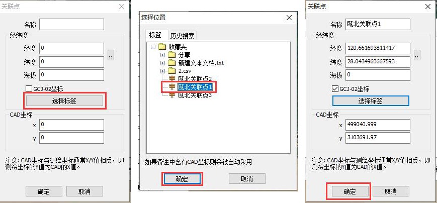 ☆若用戶創(chuàng)建了三個關(guān)聯(lián)點標(biāo)簽,點擊【選擇標(biāo)簽】按鈕,選擇第一個標(biāo)簽,系統(tǒng)會自動填入該點的經(jīng)緯度坐標(biāo)和與之對應(yīng)的平面坐標(biāo),點擊【確定】按鈕,即可添加一個關(guān)聯(lián)點。以此類推,添加三個。