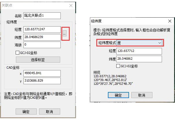 ☆若用戶已有坐標(biāo)點的經(jīng)緯度坐標(biāo)和與之對應(yīng)的平面坐標(biāo),直接填寫經(jīng)緯度坐標(biāo)和CAD坐標(biāo)。輸入經(jīng)緯度時,可以設(shè)置經(jīng)緯度的格式,有“度”“度分”“度分秒”三個格式。另外,若用戶的經(jīng)緯度坐標(biāo)為GCJ-02坐標(biāo)(中國GCJ-02經(jīng)緯度),需要勾選【GCJ-02坐標(biāo)】;如果為CGCS2000地理坐標(biāo),那么不需要勾選【GCJ-02坐標(biāo)】。