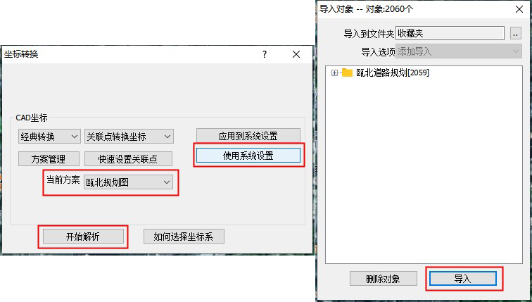 進(jìn)入[坐標(biāo)轉(zhuǎn)換]窗口,由于之前已經(jīng)設(shè)置好了系統(tǒng)坐標(biāo)系,因此這里直接點擊【使用系統(tǒng)設(shè)置】,當(dāng)前方案選擇剛才創(chuàng)建的關(guān)聯(lián)點方案。點擊【開始解析】,系統(tǒng)解析文件;點擊【導(dǎo)入】,系統(tǒng)執(zhí)行導(dǎo)入。