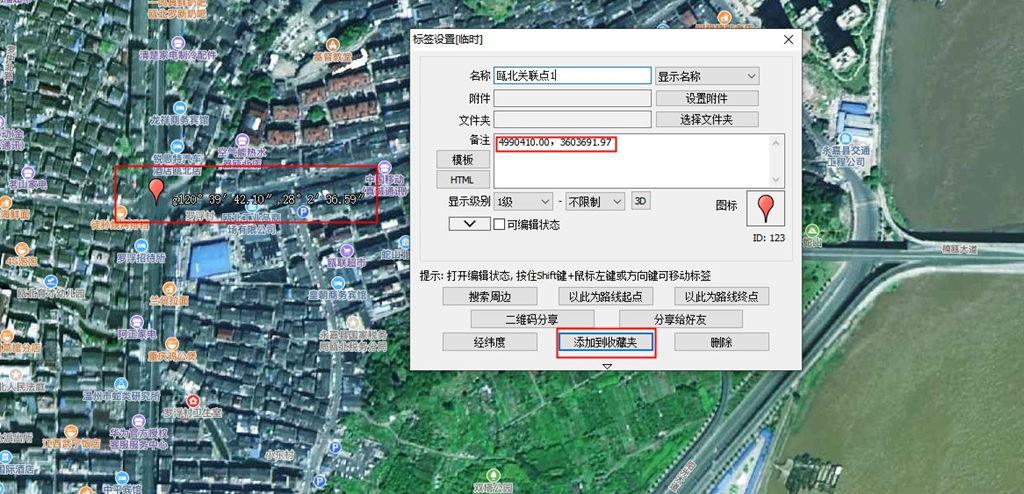 然后在奧維中找到對應(yīng)的點,在該點處創(chuàng)建標(biāo)簽,將該點的CAD坐標(biāo)填寫在備注欄目下面(只需要填寫X和Y,不需要高程),輸入名稱,并點擊【保存】,將標(biāo)簽保存到收藏夾。