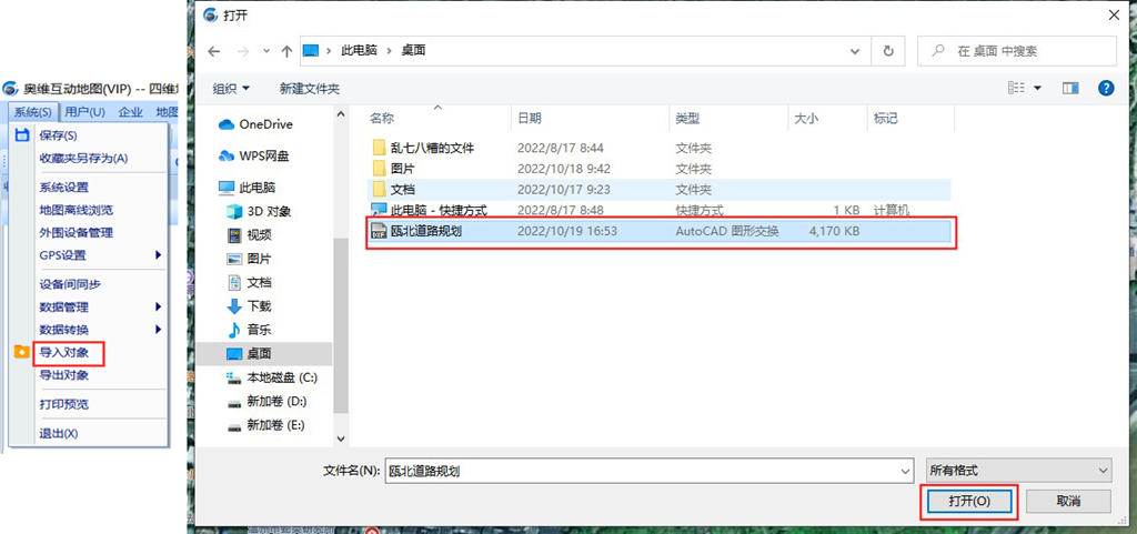 在奧維中,點擊[系統(tǒng)]→【導(dǎo)入對象】,選擇CAD文件,點擊【打開】。