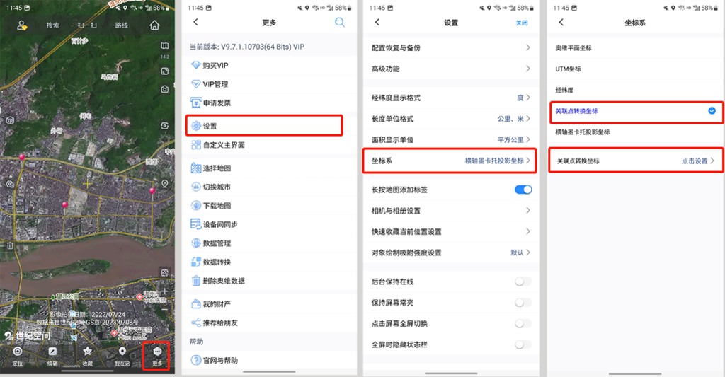 創(chuàng)建完三個關(guān)聯(lián)標(biāo)簽后,在手機(jī)端主界面點擊【更多】→【設(shè)置】→【坐標(biāo)系】,選擇【關(guān)聯(lián)點轉(zhuǎn)換坐標(biāo)】,點擊設(shè)置。