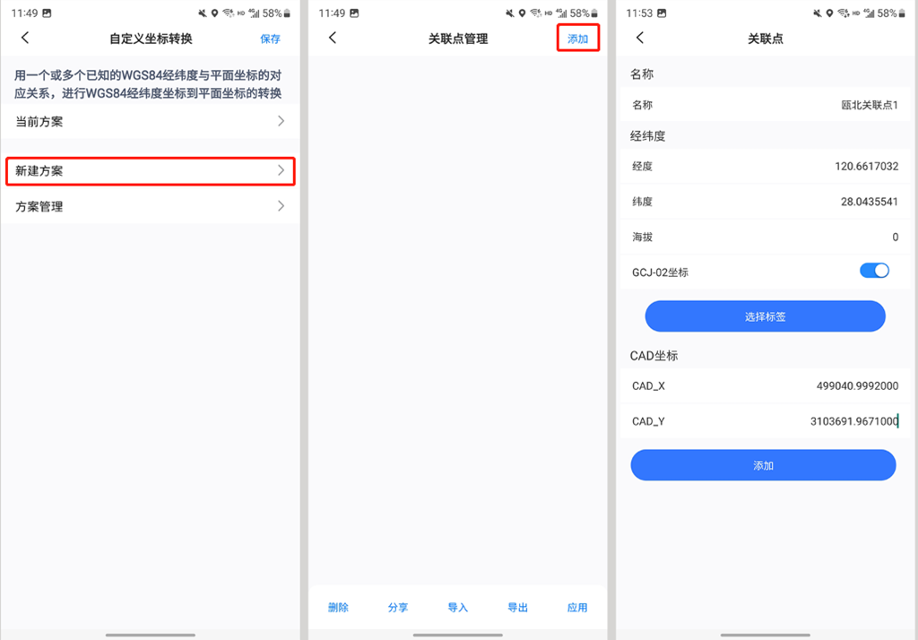 進(jìn)入[自定義坐標(biāo)轉(zhuǎn)換]頁面;點擊【新建方案】按鈕,點擊【添加】,進(jìn)入[關(guān)聯(lián)點]頁面。