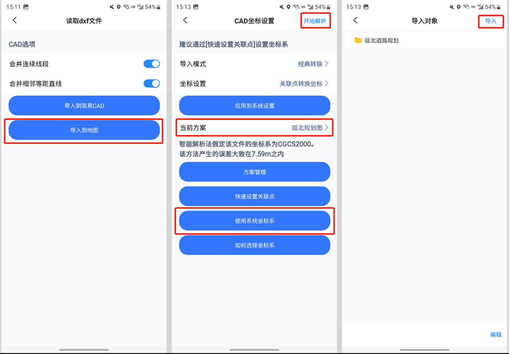 進(jìn)入[CAD坐標(biāo)設(shè)置]頁面,由于之前我們已經(jīng)設(shè)置好了系統(tǒng)坐標(biāo)系,因此這里我們可以直接點擊【使用系統(tǒng)坐標(biāo)系】,點擊【開始解析】,系統(tǒng)解析文件;解析完成后,點擊【導(dǎo)入】。