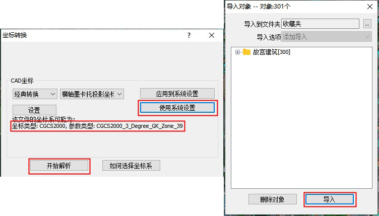 進入[坐標轉(zhuǎn)換]窗口,由于之前我們已經(jīng)設(shè)置好了系統(tǒng)坐標系,因此這里我們可以直接點擊【使用系統(tǒng)設(shè)置】,點擊【開始解析】,系統(tǒng)解析文件;點擊【導入】,系統(tǒng)執(zhí)行導入。