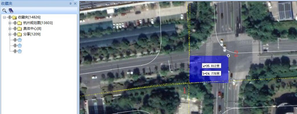 如下圖所示,標(biāo)識(shí)“1”的位置應(yīng)為道路交叉中心,即實(shí)際位置大致為標(biāo)識(shí)“2”所處的位置。通過(guò)矩形,可以看到這些數(shù)據(jù)整體向西偏移了35.812米(a),向南偏移了24.778米(b)。