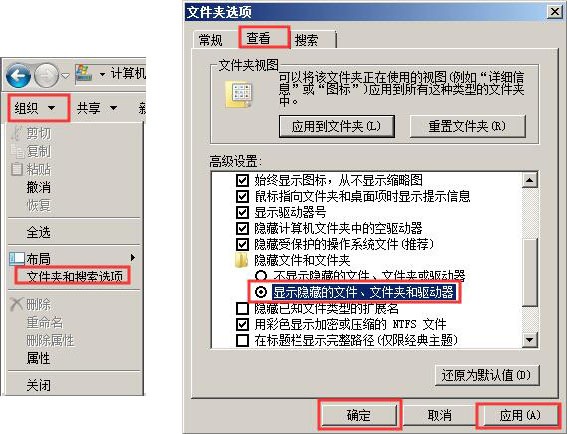 進(jìn)入到C盤,點(diǎn)擊【組織】,點(diǎn)擊【文件夾和搜索選項(xiàng)】,在[查看]選項(xiàng)卡下,選中“顯示隱藏的文件、文件夾和驅(qū)動器”,點(diǎn)擊【應(yīng)用】,點(diǎn)擊【確定】。