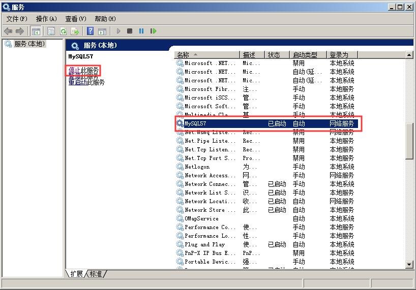 找到MySQL57,點(diǎn)擊【停止】,停止MySQL服務(wù)。