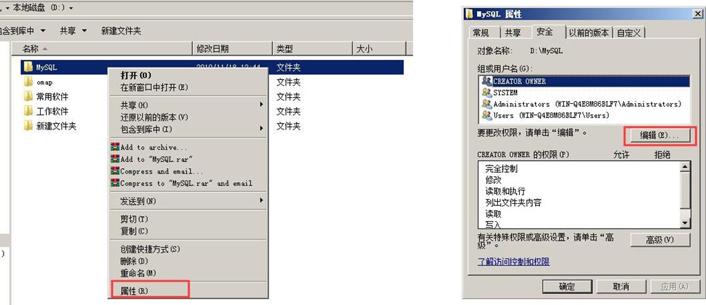 在新的目錄下,選中我們剛創(chuàng)建的文件夾(MySQL),點(diǎn)擊鼠標(biāo)右鍵,點(diǎn)擊【屬性】,點(diǎn)擊[安全],點(diǎn)擊【編輯】。