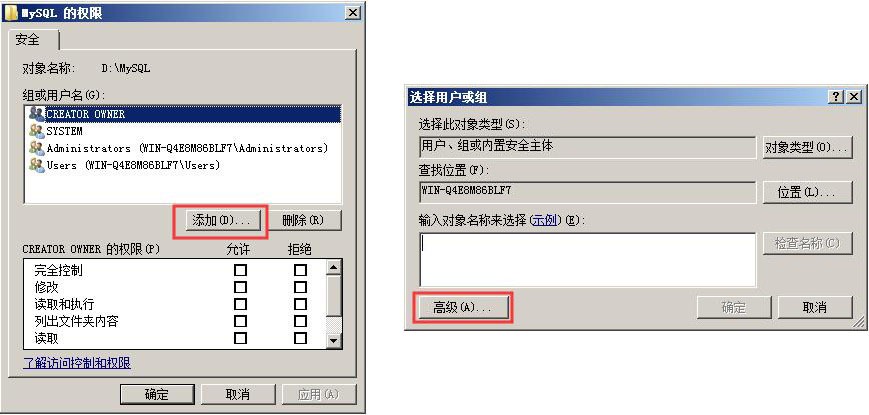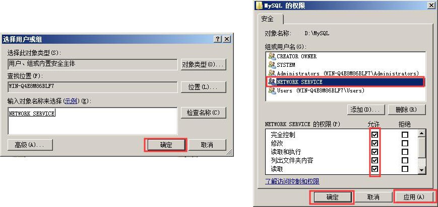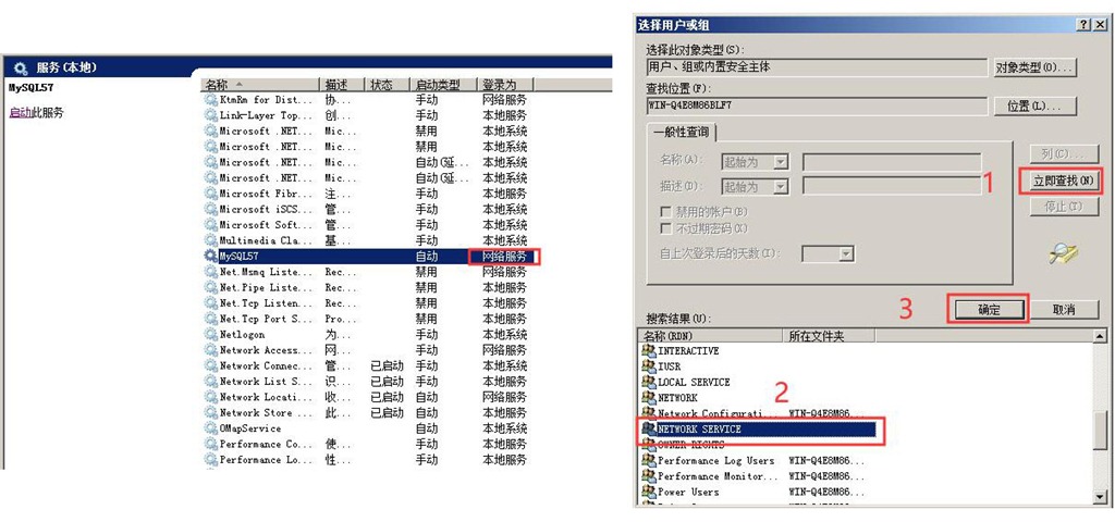 若MySQL的服務(wù)為“網(wǎng)絡(luò)服務(wù)”,那么在【搜索結(jié)果】中選擇【NETWORK SERVICE】,點(diǎn)擊【確定】。