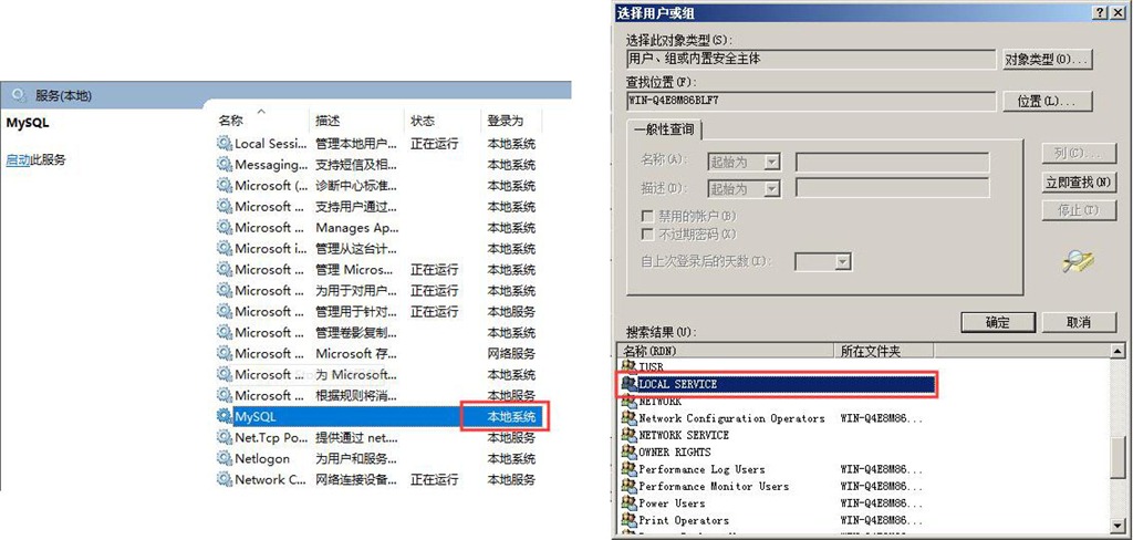 若MySQL的服務(wù)為“本地服務(wù)”,那么在【搜索結(jié)果】中選擇【LOCAL SERVICE】,點(diǎn)擊【確定】。