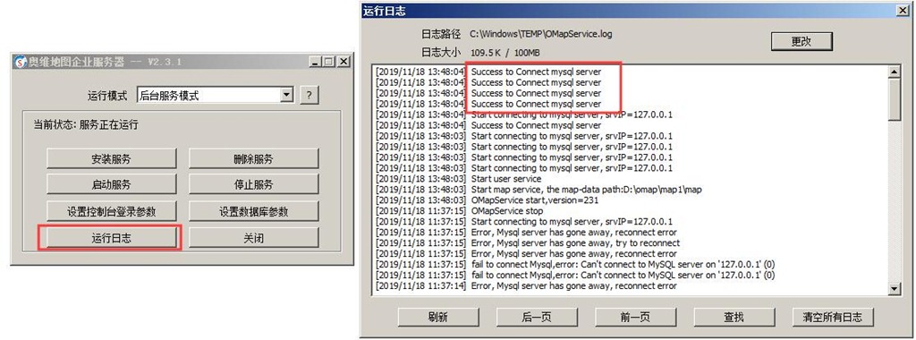 在奧維地圖企業(yè)服務(wù)器中,點(diǎn)擊【運(yùn)行日志】,我們可以查看到奧維企業(yè)服務(wù)器已經(jīng)成功連接數(shù)據(jù)庫。