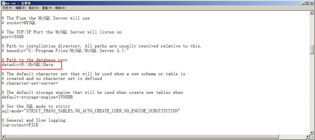 用記事本打開my.ini文件,修改datadir參數(shù),設(shè)置為新的目錄(D:\MySQL\Data),關(guān)閉該文件。