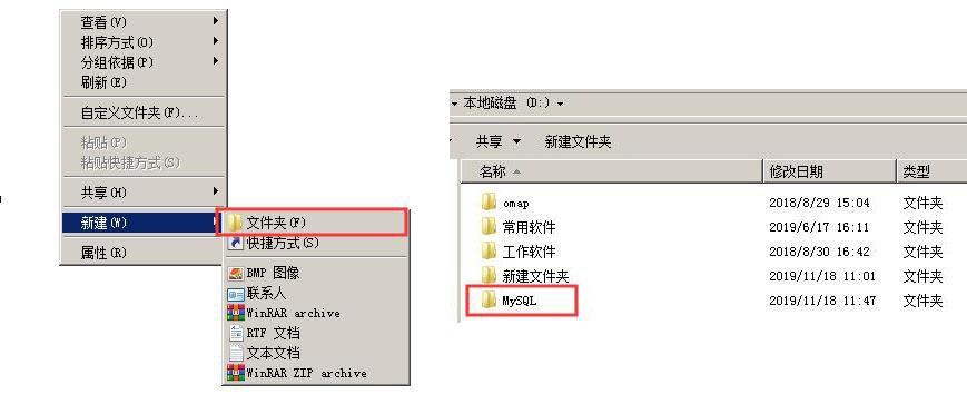 在新的磁盤下創(chuàng)建數(shù)據(jù)存儲目錄,如在D盤下創(chuàng)建MySQL文件夾。