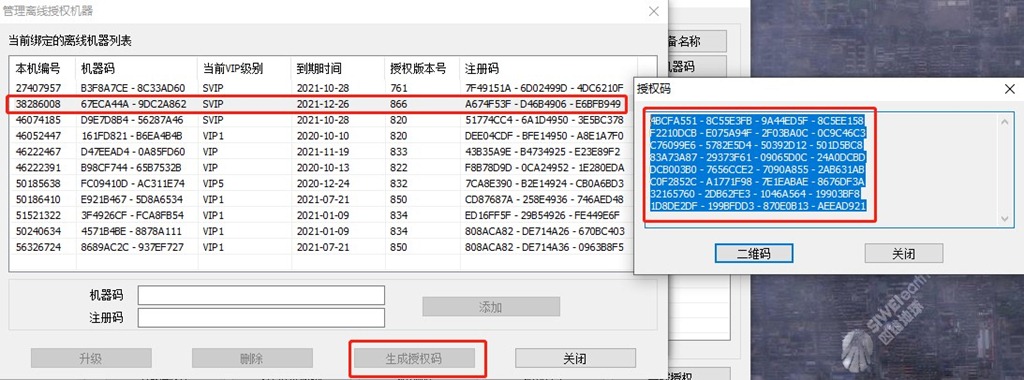 在[管理離線授權(quán)機(jī)器]窗口中選擇該機(jī)器,點(diǎn)擊【生成授權(quán)碼】,即可生成新的授權(quán)碼。