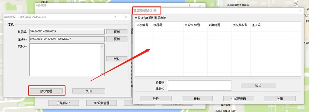 在電腦A的奧維中,點(diǎn)擊[幫助]—>【VIP管理】—>【離線授權(quán)】—>【授權(quán)管理】,輸入新的機(jī)器碼和注冊(cè)碼,點(diǎn)擊【添加】。