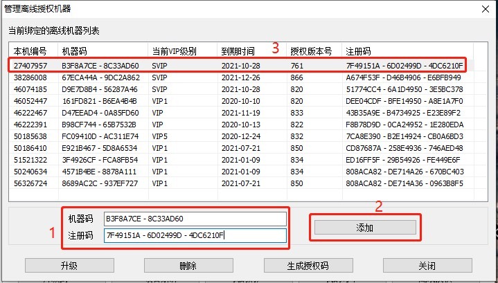 在【機(jī)器碼】和【注冊(cè)碼】欄中填入離線機(jī)器的機(jī)器碼和注冊(cè)碼,點(diǎn)擊【添加】,在[管理離線授權(quán)機(jī)器]窗口中正常顯示添加的機(jī)器。