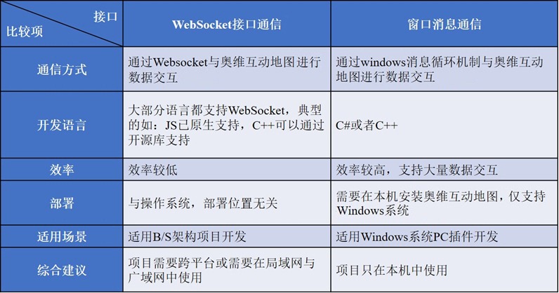 奧維互動(dòng)地圖支持第三方開發(fā)接口,允許用戶在開發(fā)第三方應(yīng)用的時(shí)候,通過(guò)奧維提供的開發(fā)接口來(lái)訪問(wèn)和操作奧維互動(dòng)地圖內(nèi)部的數(shù)據(jù)。第三方接口有兩種通信方式:WebSocket和Windows窗口消息通信。這兩種通信方式各有優(yōu)缺點(diǎn),適合不同的場(chǎng)景。