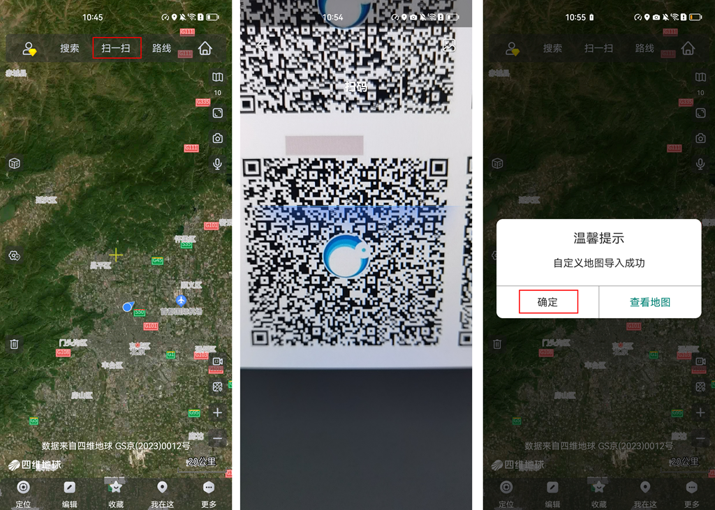 在奧維手機端主界面,點擊【掃一掃】,攝像頭對準二維碼掃描,提示“自定義地圖導入成功”,點擊【確定】。