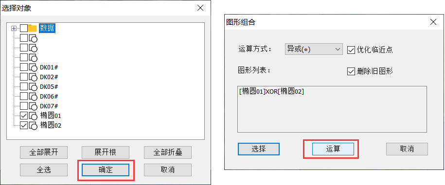 勾選需要合并的圖形,點(diǎn)擊【確定】—>【運(yùn)算】,提示“操作成功”即可。