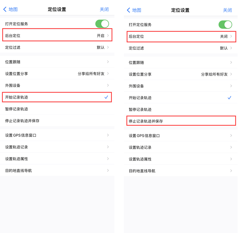 記錄軌跡:打開“后臺定位”,選擇“開始記錄軌跡”,即可記錄行動(dòng)軌跡,結(jié)束時(shí)選擇“停止記錄軌跡并保存”,同時(shí)關(guān)閉“后臺定位”(否則耗電大)