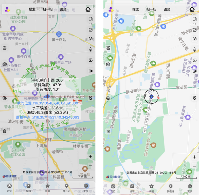 再次點(diǎn)擊,則顯示當(dāng)前位置的各項(xiàng)數(shù)據(jù),三擊則顯示指南針標(biāo)識。