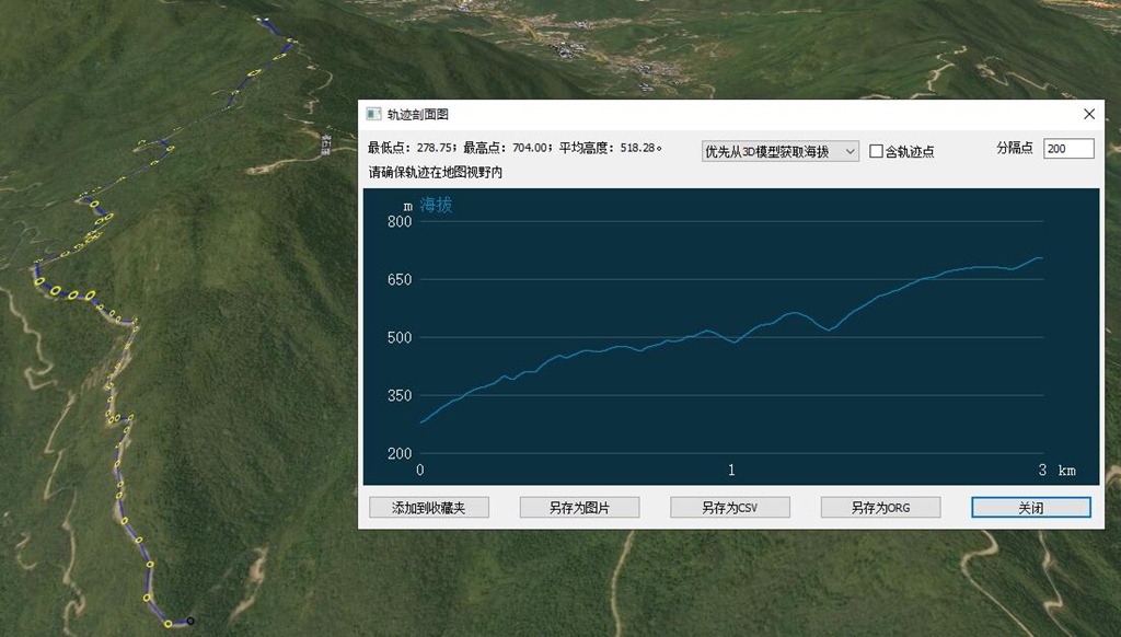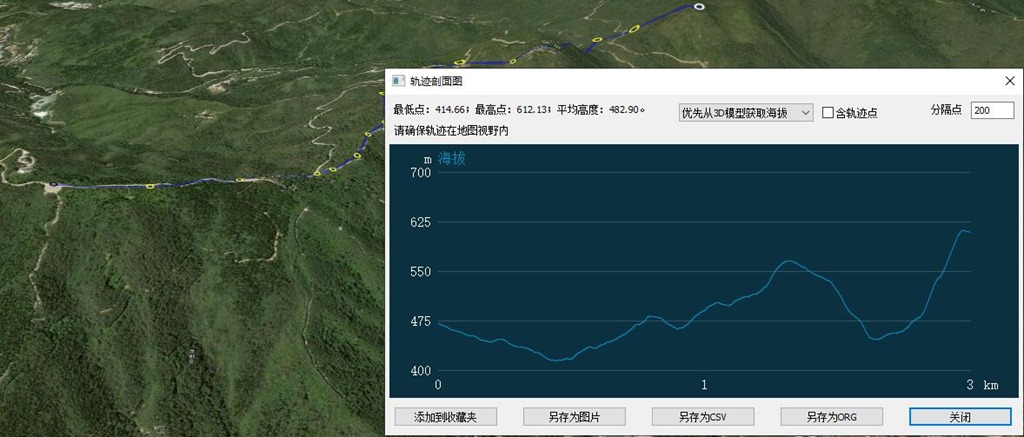 軌跡剖面圖的海拔可選擇通過軌跡點(diǎn)、高程數(shù)據(jù)或3D模型獲取,直接生成軌跡內(nèi)最低點(diǎn)、最高點(diǎn)及平均高度等數(shù)據(jù)。您也可以自行設(shè)置剖面分隔點(diǎn)個(gè)數(shù)(可選擇是否包含軌跡點(diǎn)),顯示不同精度的剖面圖,生成后的軌跡剖面圖可另存為圖片、CSV、ORG等文件格式,方便瀏覽傳閱。