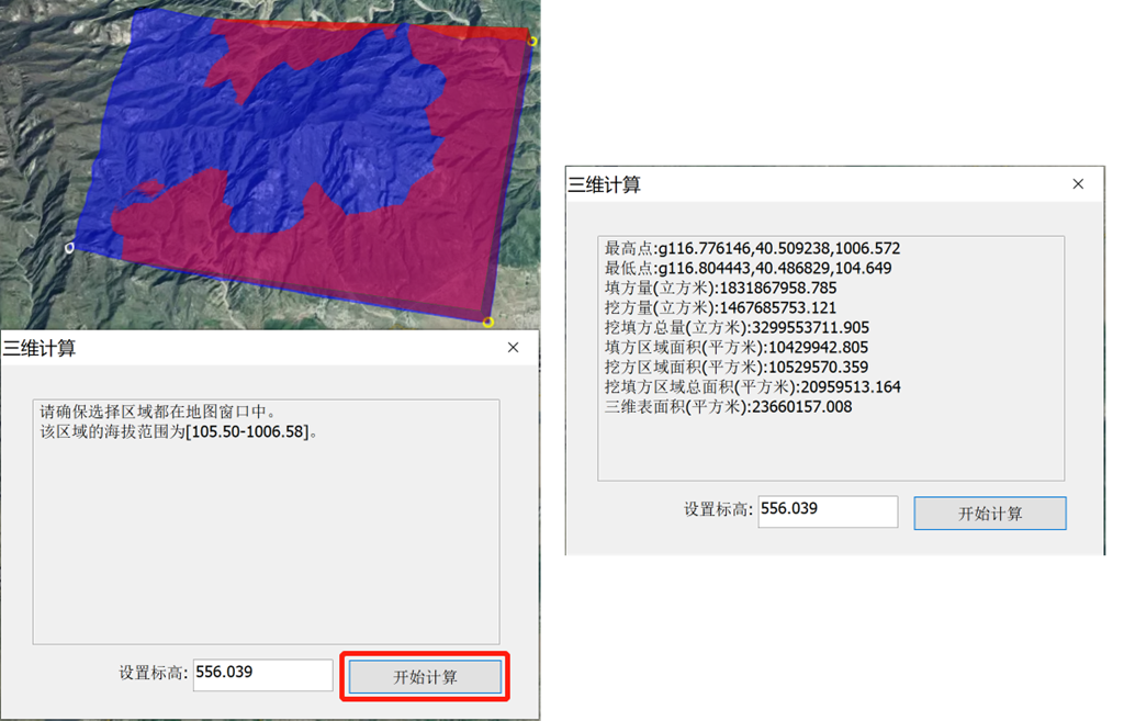 然后您設(shè)置標(biāo)高,點(diǎn)擊【開始計(jì)算】,系統(tǒng)自動(dòng)計(jì)算出最高點(diǎn)、最低點(diǎn)、挖填方量、挖填方區(qū)域面積、三維表面積等數(shù)據(jù)。
