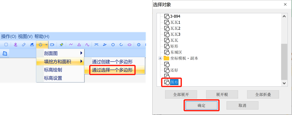 點(diǎn)擊工具欄圖片12按鈕—>【挖填方和面積】—>【通過選擇一個(gè)多邊形】,選擇一個(gè)多邊形,點(diǎn)擊【確定】。