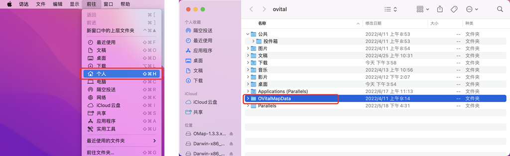 在桌面上點擊【前往】→【個人】→【OvitalMapData】,即可進入奧維根目錄。