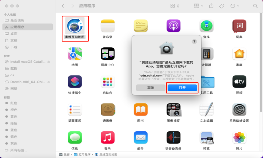 在[應(yīng)用程序]欄目,雙擊【奧維互動地圖】,點擊【打開】,即可執(zhí)行安裝。