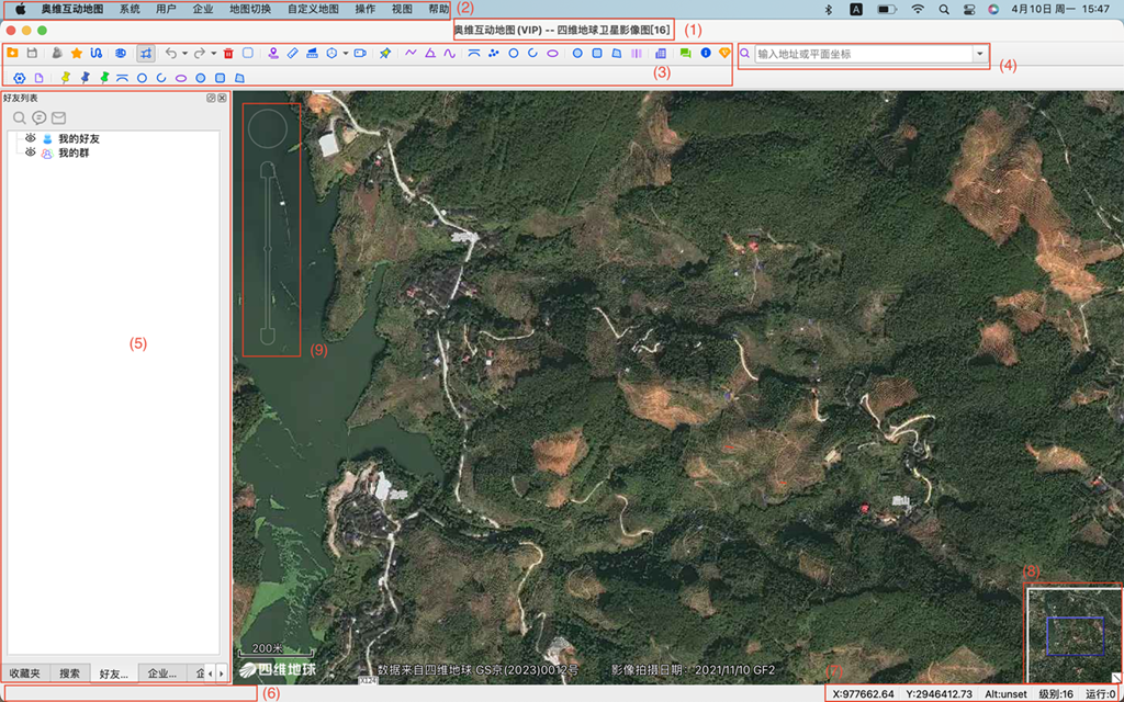 (1)標題欄:包含軟件名稱、當前綁定機器VIP等級、地圖類型及其當前顯示級別;當用戶登錄奧維賬號和企業(yè)賬號時,會增加顯示當前登錄的用戶名和企業(yè)用戶名。