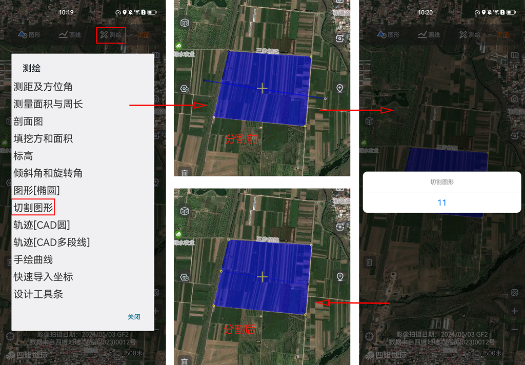 在奧維主界面,點擊【編輯】→【測繪】→【切割圖形】按鈕,繪制一條線段穿過需要切割的圖形,點擊圖片13結(jié)束,彈出[切割圖形]對話框;點擊切割圖形名稱【11】,圖形一分為二。