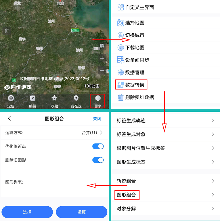 在奧維手機端,點擊[更多]→【數(shù)據(jù)轉(zhuǎn)換】→【圖形組合】;運算方式,選擇【合并】,點擊【選擇】。