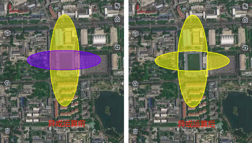 異或運算:將多個圖形相交(重疊)部分刪除,并組合成一個圖形。如果多個不相交的圖形作“異或”運算,其效果為圖形“合并”。
